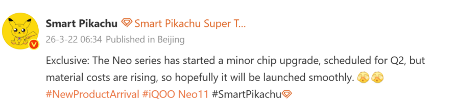 كشف التسريبات أن هاتف iQOO Neo 11 القادم سيأتي بترقية طفيفة في المعالج، حيث سيتم استبدال معالج Snapdragon بمعالج Dimensity SoC
