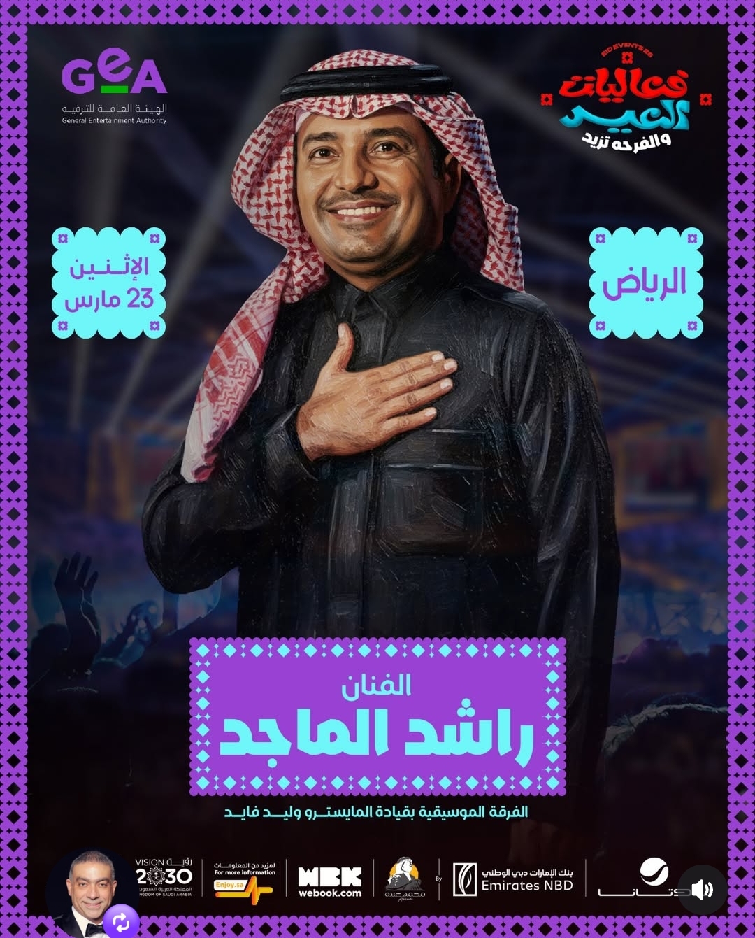 ويحيي راشد الماجد، حفل عيد الفطر على مسرح محمد عبده أرينا بمدينة الرياض، بمصاحبة الفرقة الموسيقية بقيادة المايسترو وليد الفايد.