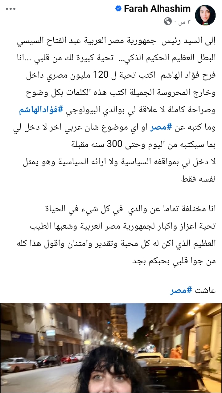 ووجهت الهاشم عبر حسابها على "فيسبوك"، رسالة وتحية للرئيس عبدالفتاح السيسي ووصفته بـ "البطل العظيم الحكيم"، مؤكدة أنها تكتب لـ 120 مليون مصري لتعلن صراحة: "لا علاقة لي بوالدي البيولوجي فؤاد الهاشم وما كتبه عن مصر.. لا دخل لي بما سيكتبه من اليوم وحتى 300 سنة مقبلة".