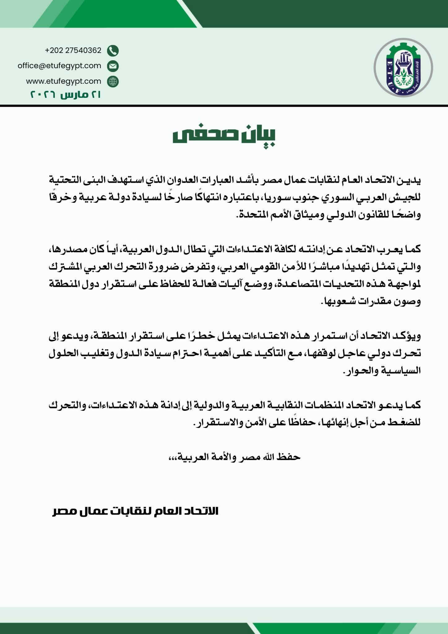 أدان الاتحاد العام لنقابات عمال مصر، بأشد العبارات، العدوان الذي استهدف البنى التحتية للجيش العربي السوري في جنوب سوريا، مؤكدًا أنه يُعد انتهاكًا صارخًا لسيادة دولة عربية وخرقًا واضحًا لقواعد القانون الدولي وميثاق الأمم المتحدة.
