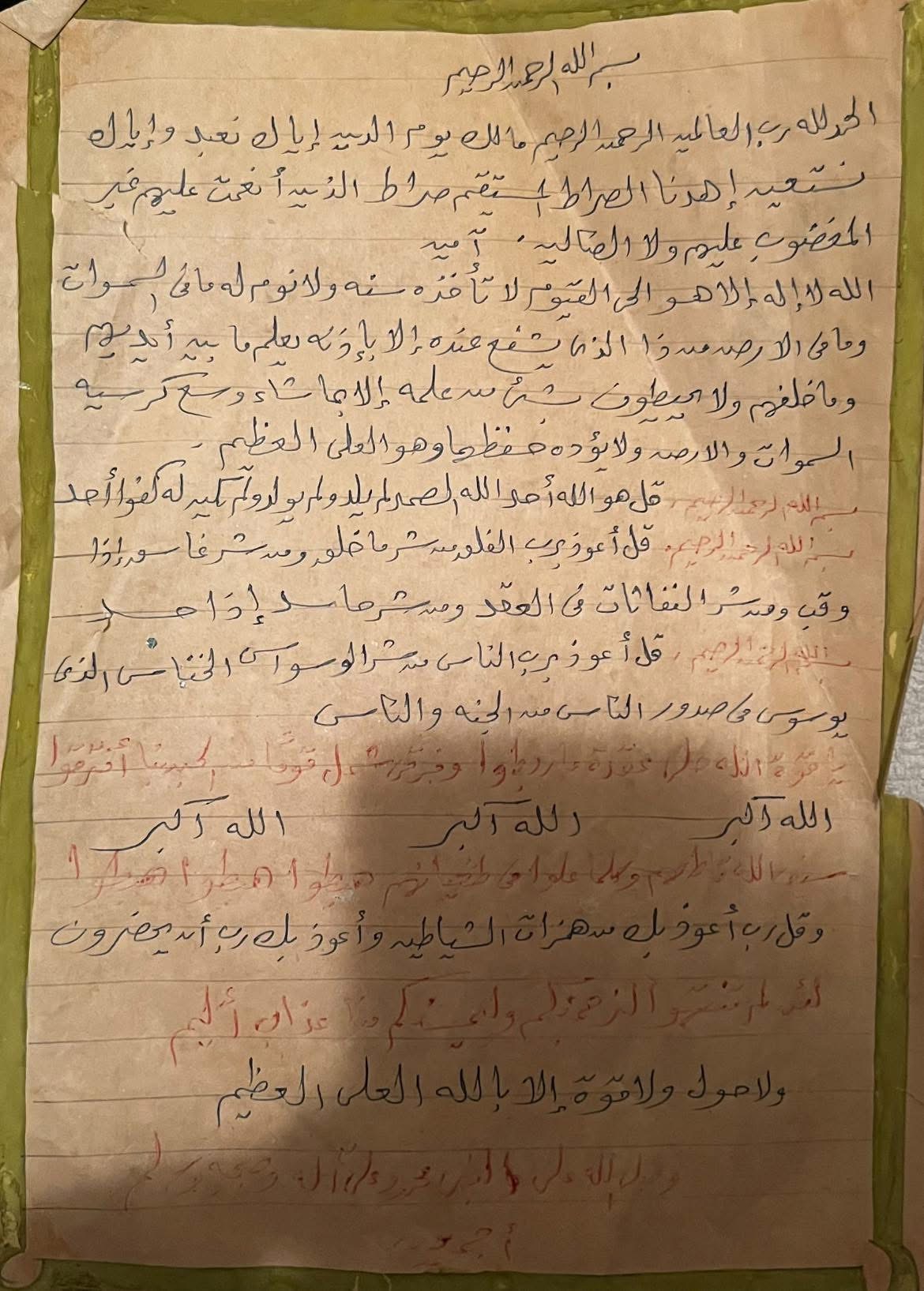 وتضمنت الورقة عددا من السور والآيات، منها سورة الفاتحة وآية الكرسى، إلى جانب سور الإخلاص والمعوذتين، فضلا عن مجموعة من الأدعية التى كان يحرص على قراءتها باستمرار.