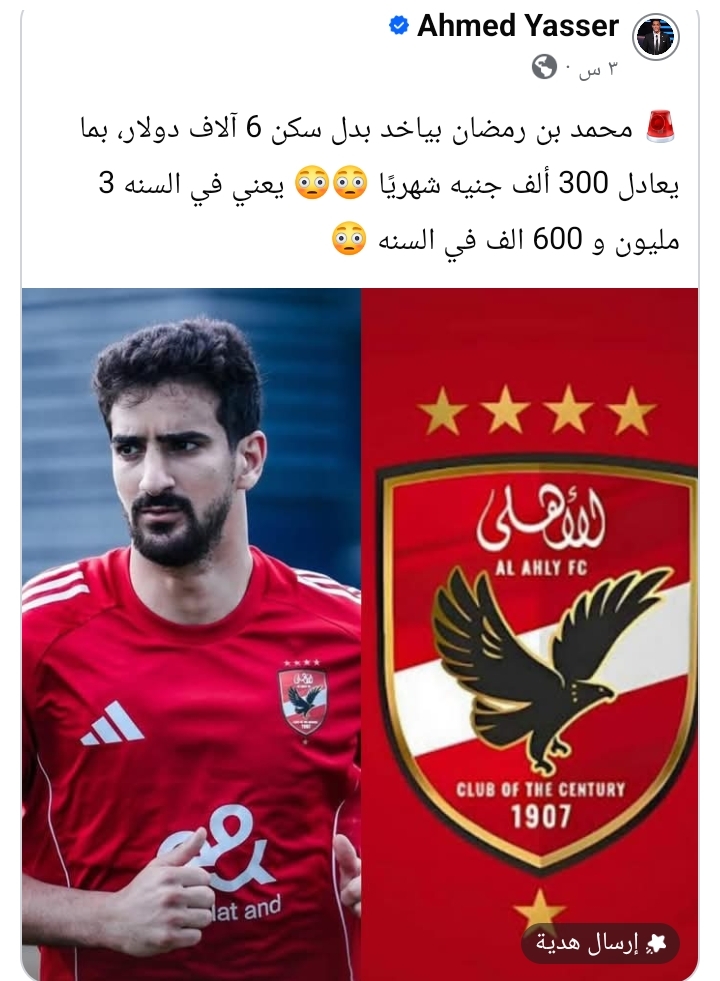 وكتب ياسر عبر حسابه على فيسبوك: "محمد بن رمضان لاعب الأهلي بياخد بدل سكن 6 آلاف دولار، بما يعادل 300 ألف جنيه شهريًا، أي نحو 3.6 مليون جنيه في السنة".