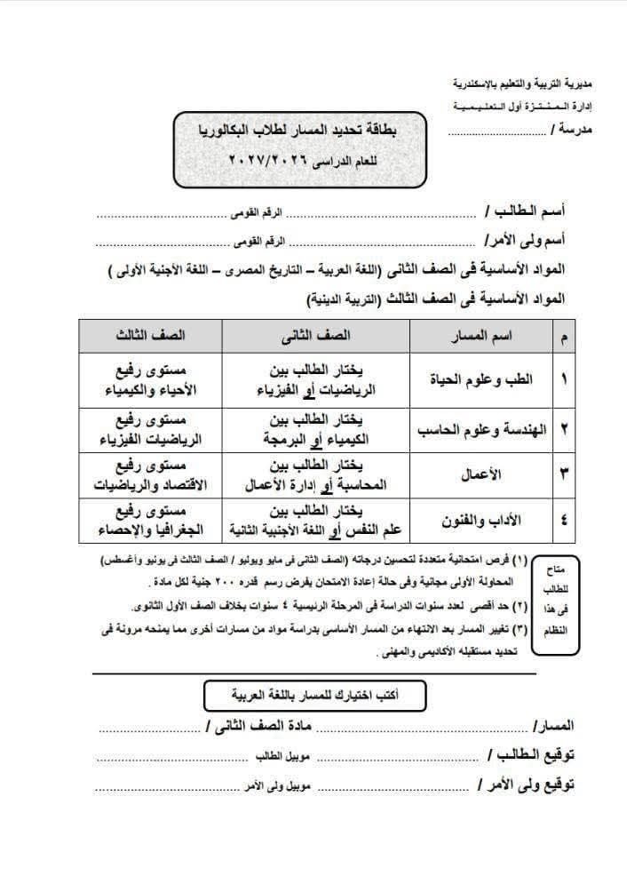 من جانبه قال شادي زلطة المتحدث الرسمي بإسم وزارة التربية والتعليم في تصريح خاص لموقع صدى البلد ، أن الصورة المتداولة على أنها بطاقة تحديد المسار لطلاب البكالوريا للعام الدراسي 2026 / 2027 ، والتي من المقرر توزيعها على طلاب “ سنة أولى بكالوريا” لتحديد مسار الدراسة ، هي صورة غير رسمية