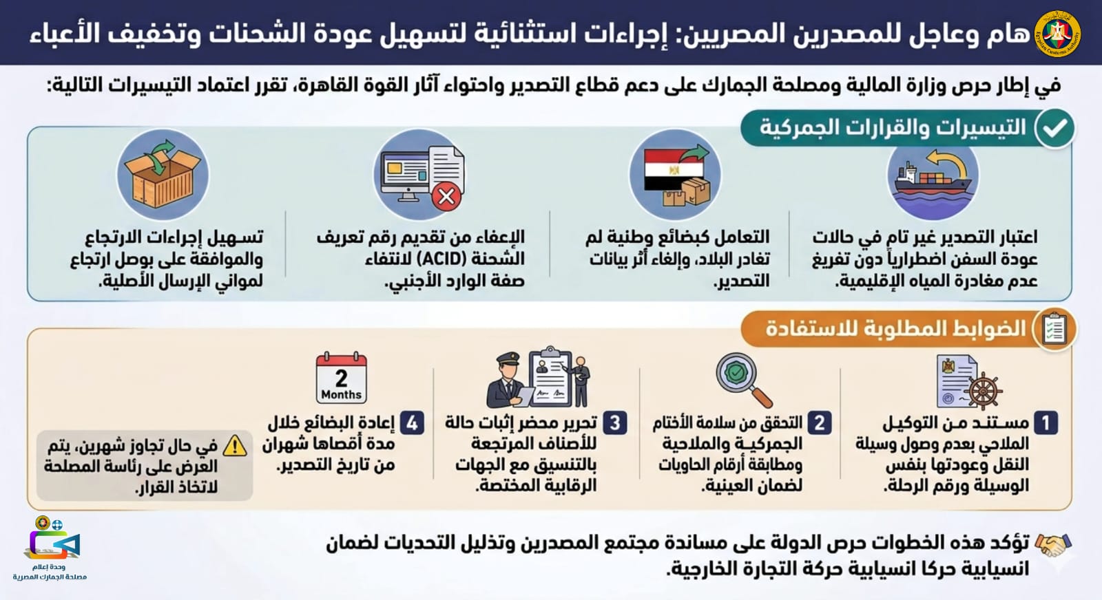 وأكد أحمد أموي رئيس مصلحة الجمارك، أن هذه التيسيرات تسرى على الشحنات العائدة خلال شهرين من تاريخ التصدير، لافتًا إلى أن هناك أولوية متقدمة لإنهاء إجراءات الشحنات المرتجعة وتخفيف الأعباء عن المصدرين.