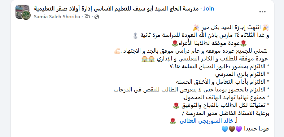 وقالت المدارس للطلاب عبر صفحاتها الرسمية على فيس بوك : نناشد الطلاب الإلتزام بمواعيد الحضور والإنصراف حرصًا على انتظام اليوم الدراسي.