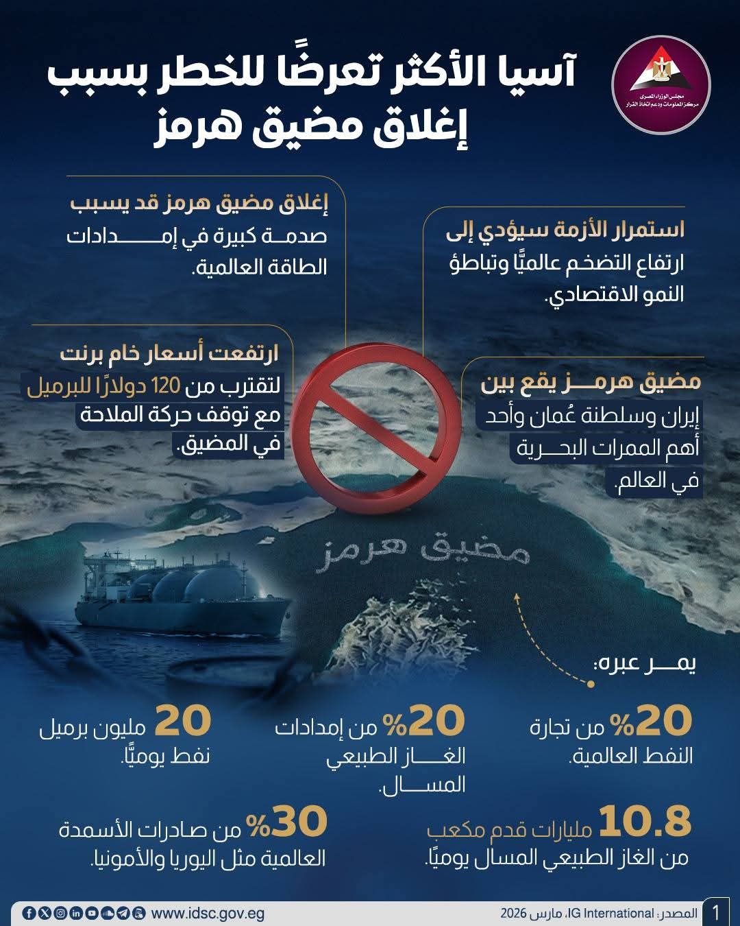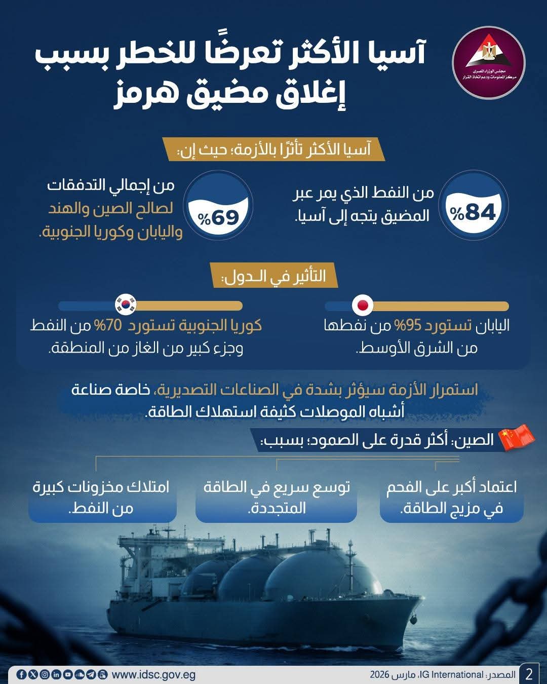 نشر مركز المعلومات ودعم اتخاذ القرار بمجلس الوزراء انفوجراف عبر صفحته الرسمية على موقع التواصل الاجتماعي فيس بوك حول أكثر القارات تعرضا للخطر بسبب إغلاق مضيق هرمز.