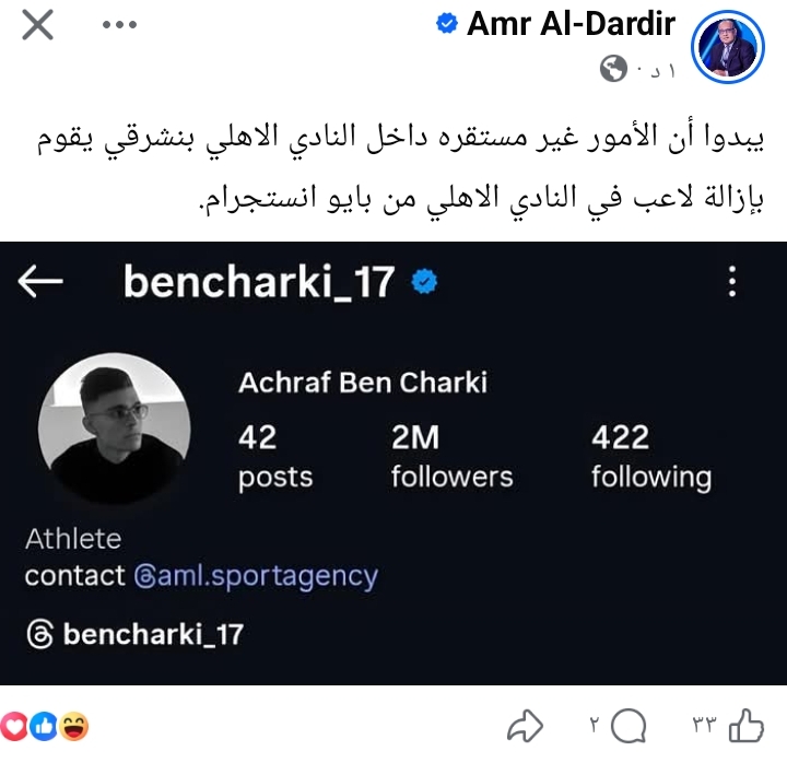 وحول هذا الأمر، نشر الناق الرياضي عمرو الدردير، عبر حسابه على “فيسبوك”، صورة لحساب بن شرقي، وعلق عليها: "يبدوا أن الأمور غير مستقرة داخل النادي الأهلي .. بنشرقي يقوم بإزالة (لاعب في النادي الإهلي) من بايو إنستجرام".