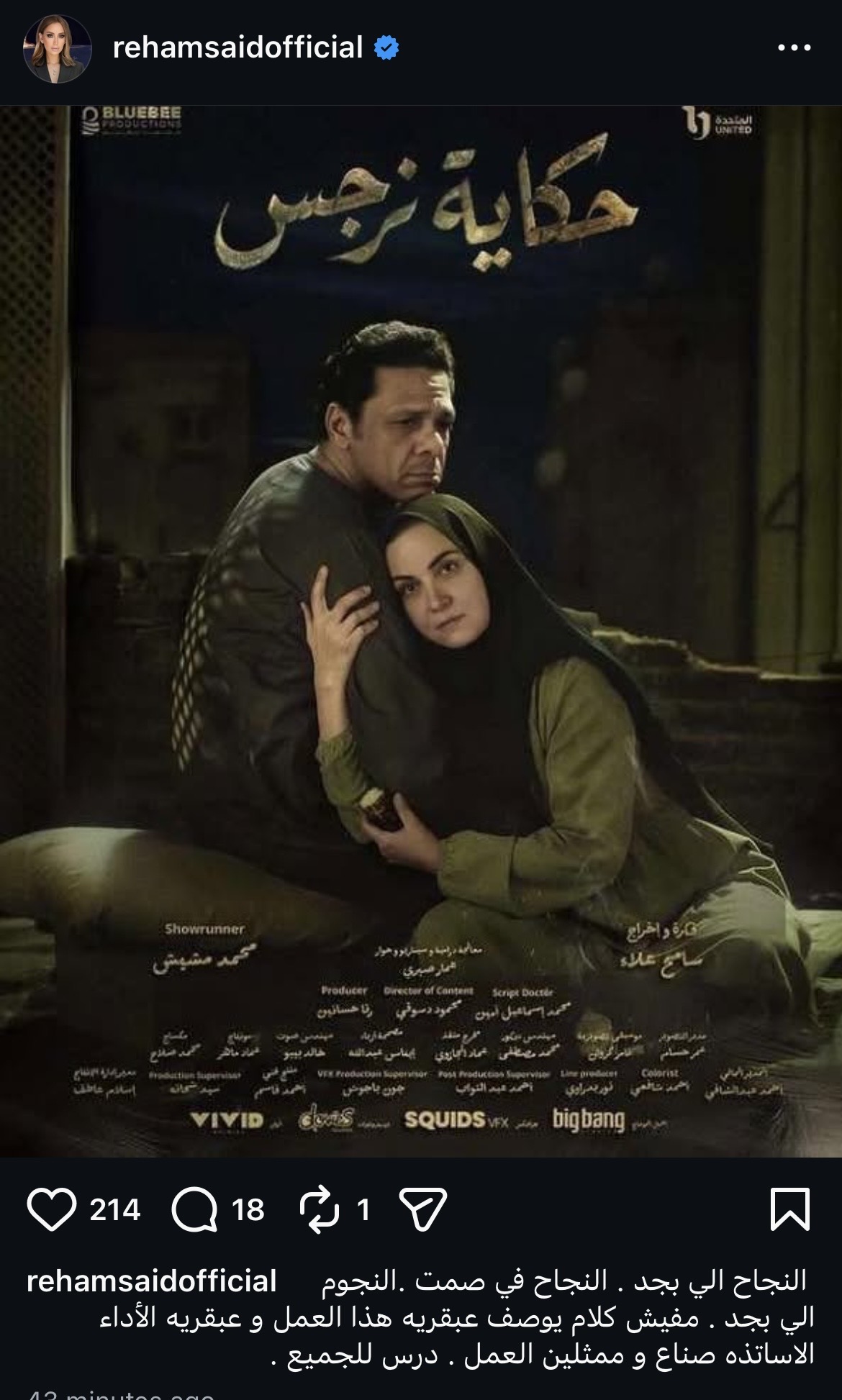 وكتبت ريهام سعيد عبر حسابها على انستجرام: “النجاح اللي بجد النجاح في صمت النجوم اللي بجد مفيش كلام يوصف عبقرية هذا العمل وعبقرية الاداء درس للجميع”.