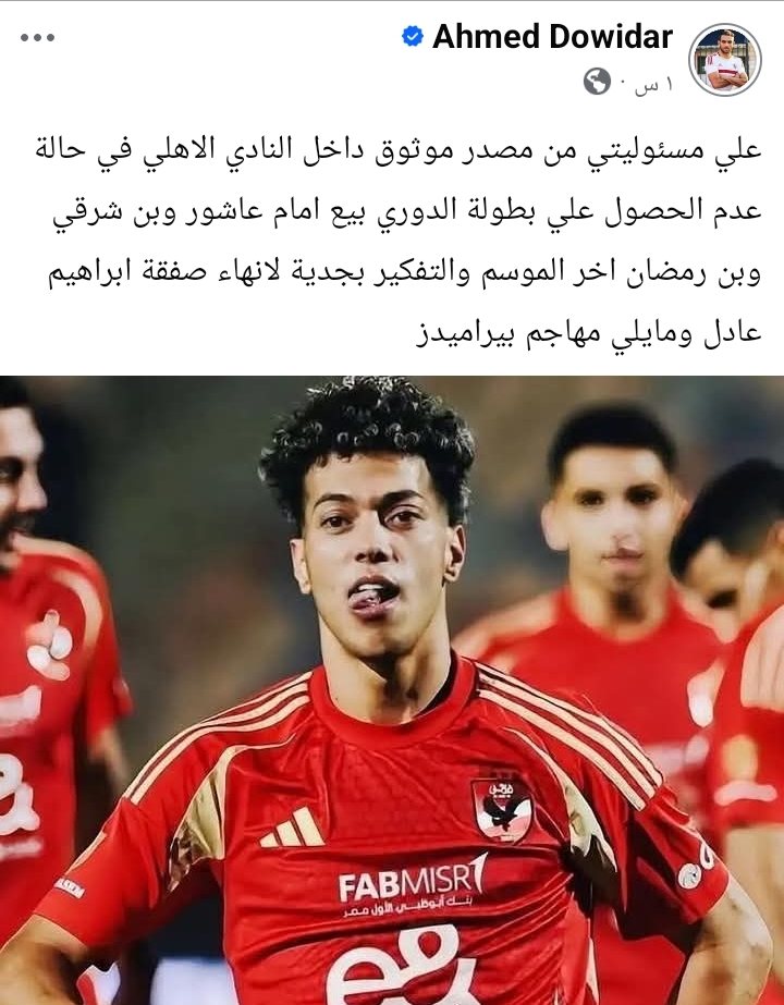 وكتب أحمد دويدار عبر حسابه على فيسبوك:"على مسؤوليتي، ومن مصدر موثوق داخل النادي الأهلي، في حالة عدم الحصول على بطولة الدوري، سيتم بيع إمام عاشور وأشرف بن شرقي ومحمد علي بن رمضان بنهاية الموسم، مع التفكير بجدية في إنهاء صفقة إبراهيم عادل، بالإضافة إلى التعاقد مع فيستون ماييلي مهاجم بيراميدز".