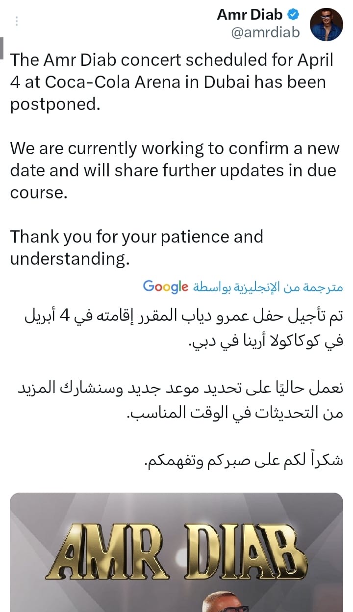 وكتب "الهضبة" فى تغريدة له عبر حسابه بـ"إكس" : "حفل عمرو دياب، الذي كان ميعاده 4 أبريل في دبي، سيتم تأجيله، ونحن حاليًا نعمل على تحديد موعد جديد، وحين يتم تحديده، سوف نكشف عنه، ونشكر جميع الجمهور على تفهمكم"