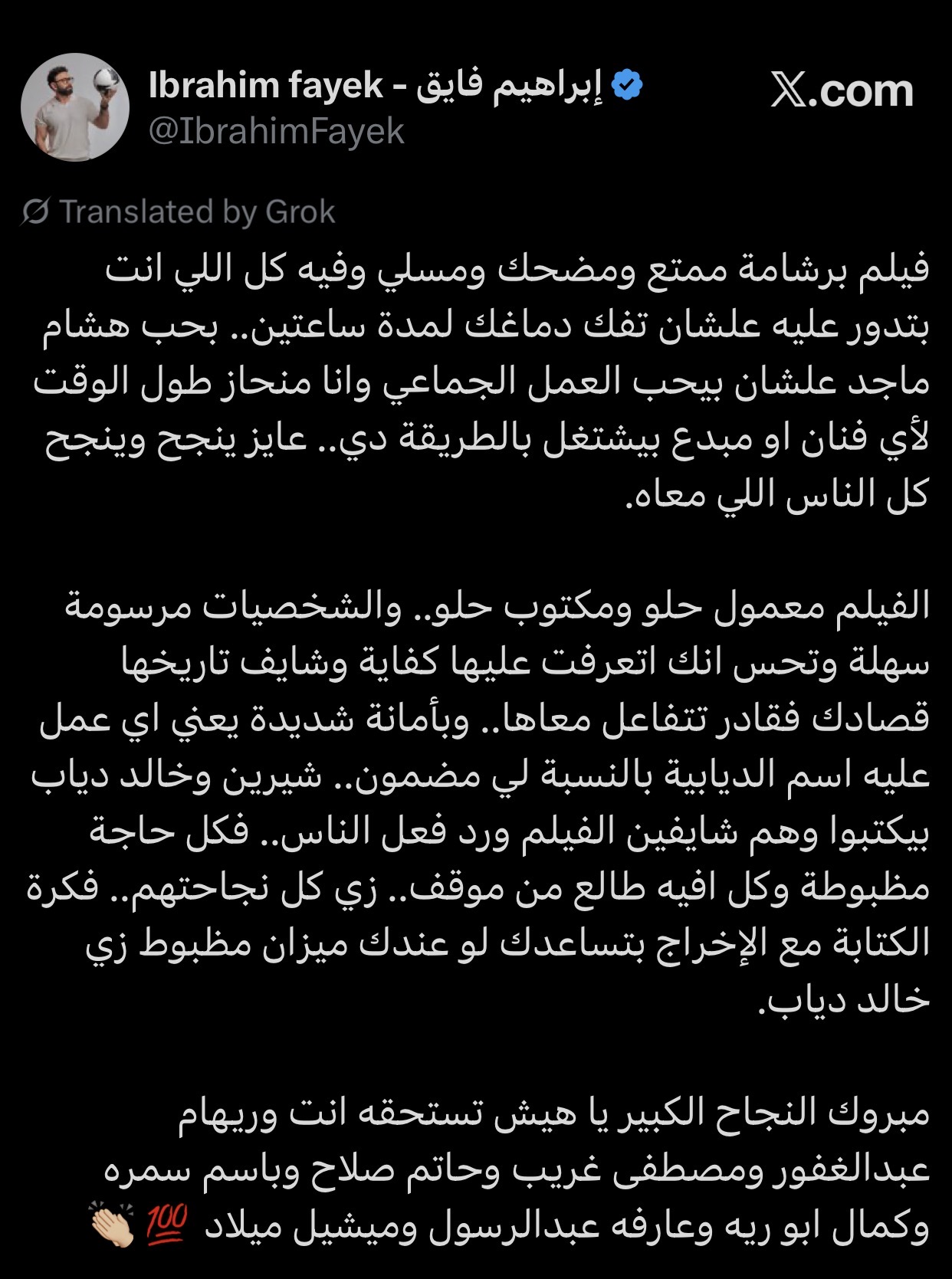 وكتب فايق عبر حسابه الشخصي على منصة إكس: “فيلم برشامة ممتع ومضحك ومسلي وفيه كل اللي انت بتدور عليه علشان تفك دماغك لمدة ساعتين.. بحب هشام ماجد علشان بيحب العمل الجماعي وانا منحاز طول الوقت لأي فنان او مبدع بيشتغل بالطريقة دي.. عايز ينجح وينجح كل الناس اللي معاه”.