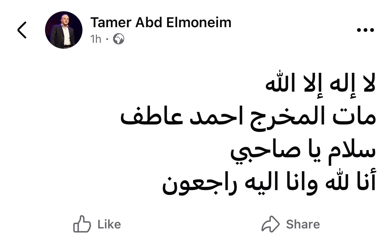 وكتب عبدالمنعم عبر حسابه الرسمي على موقع التواصل الاجتماعي فيسبوك: “لا إله إلا الله.. مات المخرج أحمد عاطف.. سلام يا صاحبي.. إنا لله وإنا إليه راجعون”، معبرًا عن حزنه لرحيل صديقه.