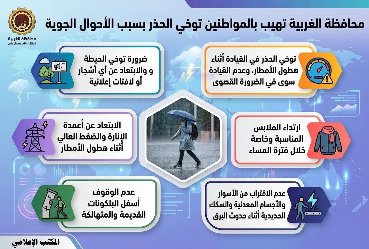 كما وجهت محافظة الغربية في بيانها الصادر بتوخي الحذر أثناء قيادة السيارات خلال هطول الأمطار الغزيرة المتوقعة حسب بيان هيئة الأرصاد الجوية فضلا عن ضرورة الابتعاد عن الأشجار واللافتات الإعلانية.