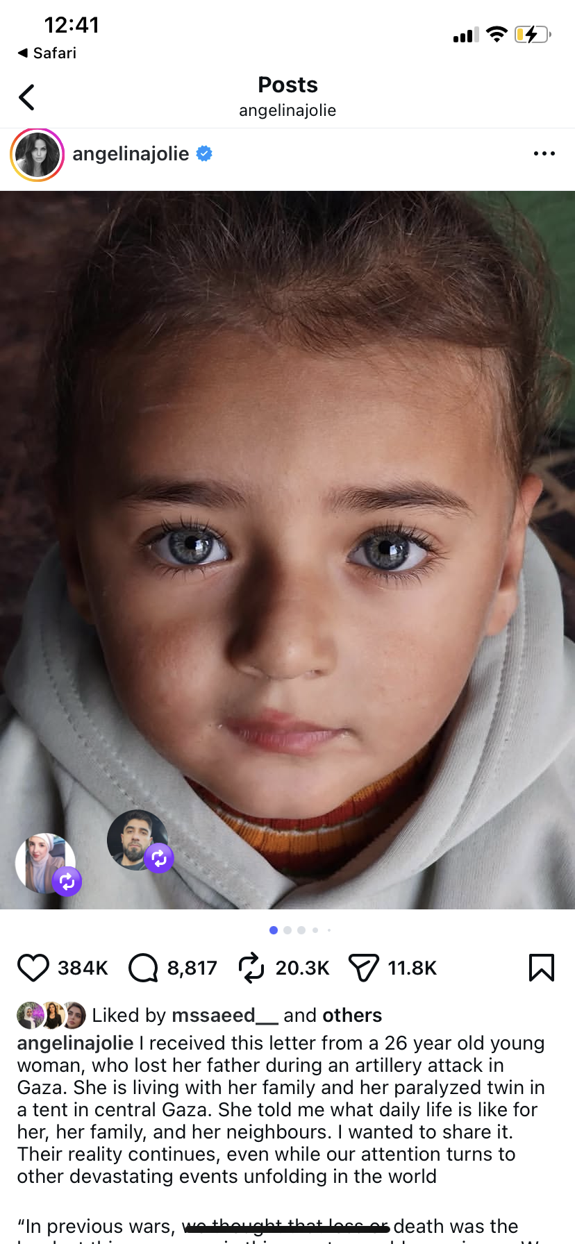 ونشرت أنجلينا الصور عبر حسابها بـ«إنستجرام»، وعلقت عليها قائلةً: "تلقيتُ هذه الرسالة من شابة تبلغ من العمر 26 عامًا، فقدت والدها خلال قصف مدفعى فى غزة، وهى تعيش مع أسرتها وتوأمها المصاب بالشلل داخل خيمة فى وسط غزة.. وقد أخبرتنى كيف تبدو الحياة اليومية بالنسبة لها، ولعائلتها، ولجيرانها.. وأردتُ أن أشاركها. فواقعهم ما زال مستمرًا، حتى بينما تتجه أنظارنا إلى أحداث مدمّرة أخرى تتكشف فى أنحاء العالم".