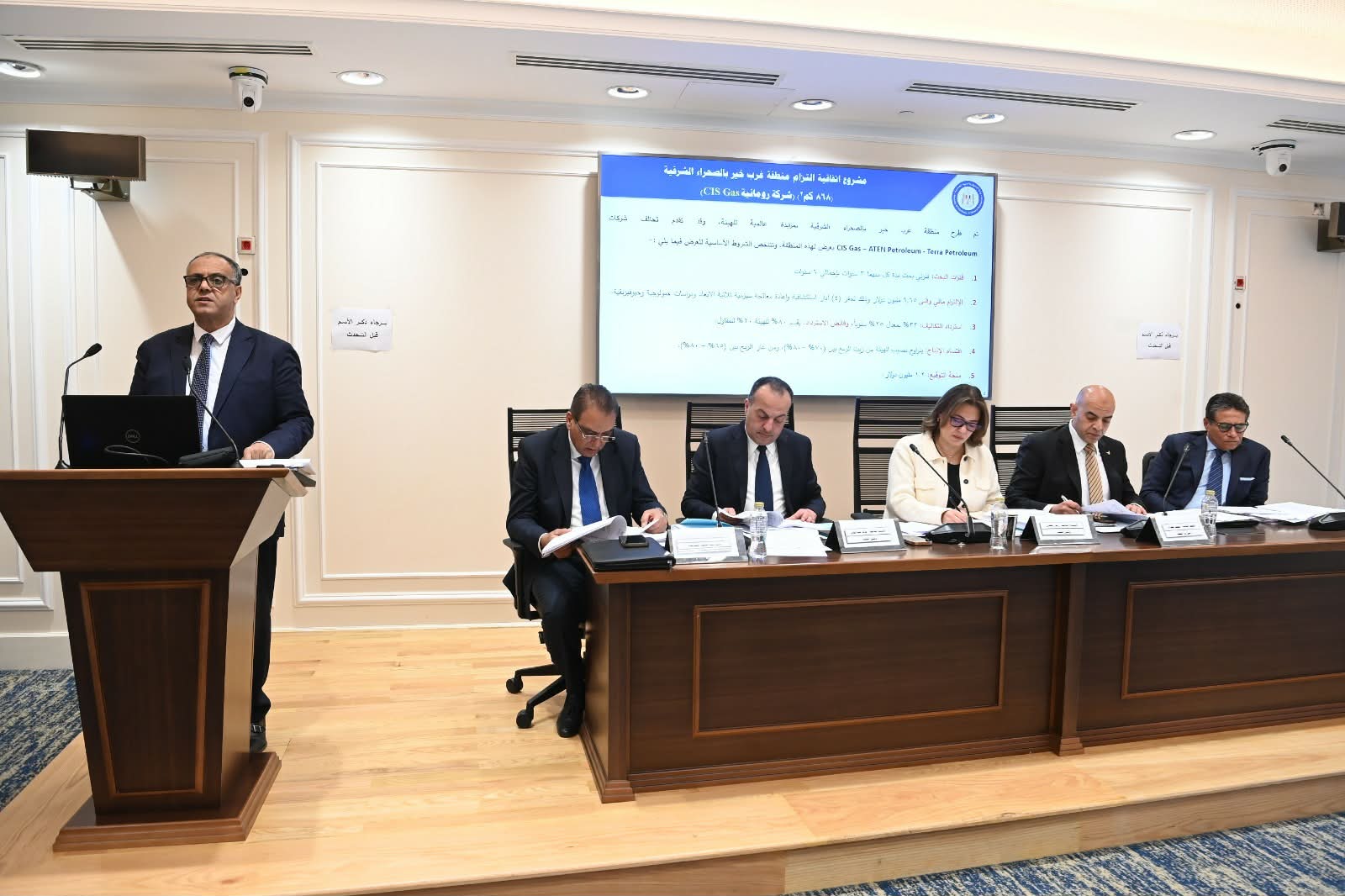 ومشروع قانون بالترخيص لوزير البترول والثروة المعدنية في التعاقد مع الهيئة المصرية العامة للبترول للبحث عن البترول وتنميتة واستغلاله في منطقتي رأس بدران وخليج الزيت بخليج السويس (ج.م.ع)، إلى جانب مشروع قانون بالترخيص لوزير البترول والثروة المعدنية في التعاقد مع الهيئة المصرية العامة للبترول وشركة كايرون أويل آند جاز ليمتد وشركة كابريكورن إيجيبت ليمتد للبحث عن البترول وتنميته واستغلاله في منطقة بدر الدين المندمجة بالصحراء الغربية (ج.م.ع).