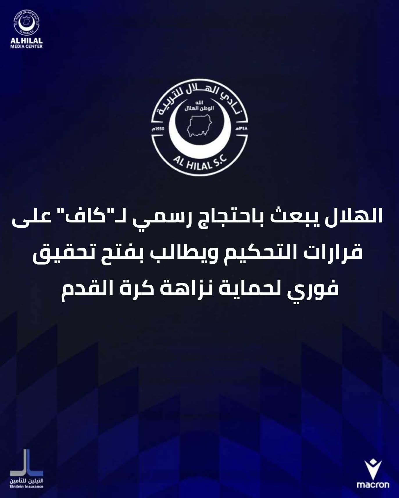 صعد نادي الهلال السوداني موقفه تجاه الاتحاد الإفريقي لكرة القدم "كاف"، بعدما تقدم باحتجاج رسمي ضد طاقم تحكيم مباراته أمام نهضة بركان في إياب ربع نهائي دوري أبطال أفريقيا.