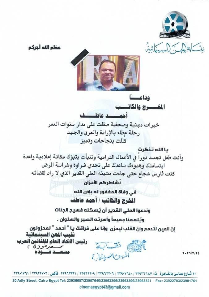 تنعي نقابة المهن السينمائية برئاسة المخرج مسعد فودة المخرج والناقد أحمد عاطف ، الذي وافته المنية صباح اليوم الثلاثاء ، وقد عبر نقيب السينمائيين عن بالغ حزنه على رحيل أحد أبناء المهنة والعمل الصحفي وكتب رثاءا قال فيه :