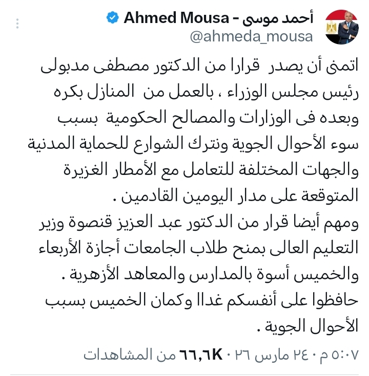 وكتب موسى عبر حسابه على منصة "إكس": "أتمنى أن يصدر قرار من الدكتور مصطفى مدبولي، رئيس مجلس الوزراء، بالعمل من المنازل غدا وبعد غد في الوزارات والمصالح الحكومية بسبب سوء الأحوال الجوية، ونترك الشوارع للحماية المدنية والجهات المختلفة للتعامل مع الأمطار الغزيرة المتوقعة على مدار اليومين القادمين".