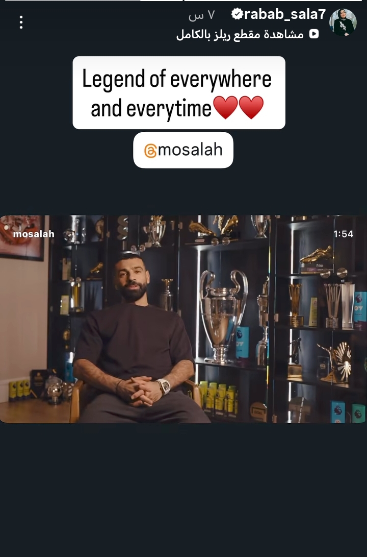 وشاركت رباب صلاح، شقيقة محمد صلاح، الفيديو الذي أعلن شقيقها من خلاله رحيله عن ليفربول، عبر حسابها الرسمي على موقع تبادل الصور والفيديوهات "انستجرام" وكتبت: "أسطورة في كل مكان وفي كل وقت".