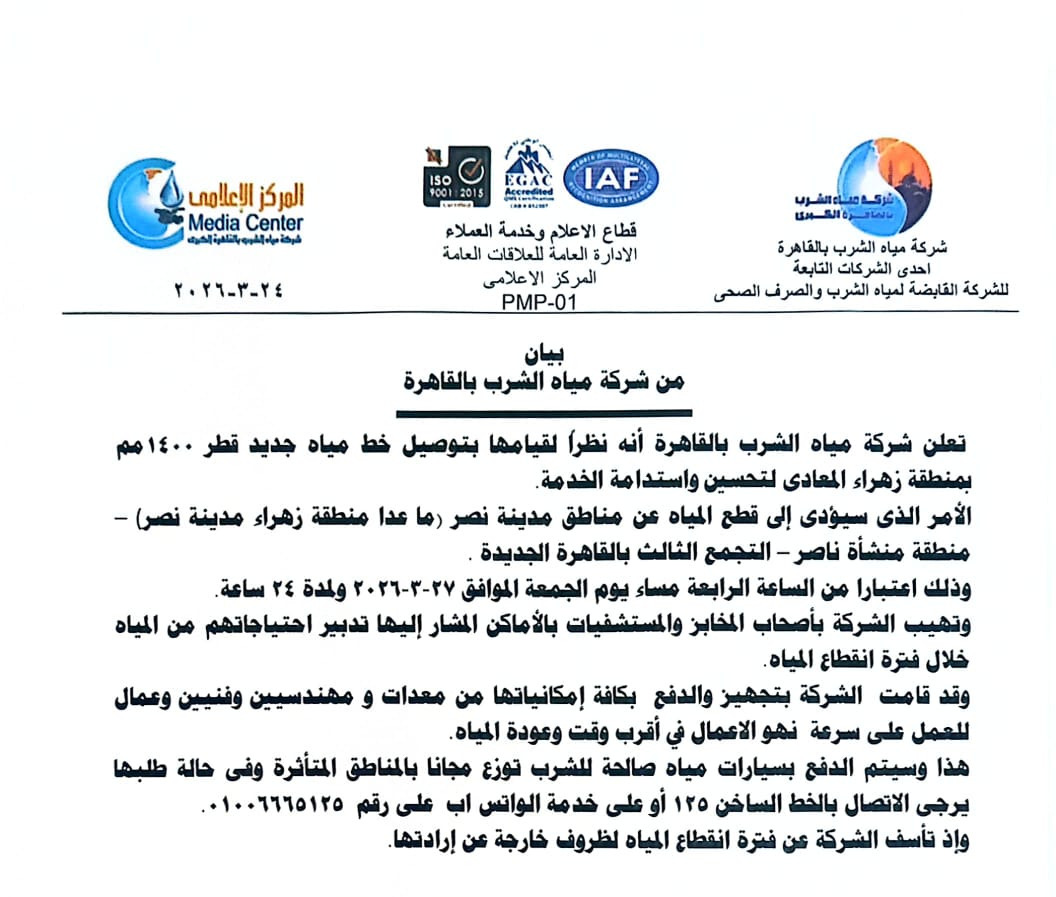 وأوضحت الشركة أن الانقطاع سيشمل مناطق: مدينة نصر (باستثناء زهراء مدينة نصر)، ومنطقة منشأة ناصر، والتجمع الثالث بالقاهرة الجديدة، على أن يبدأ الانقطاع في تمام الساعة الرابعة عصر يوم الجمعة الموافق 27 مارس 2026، ويستمر لمدة 24 ساعة.