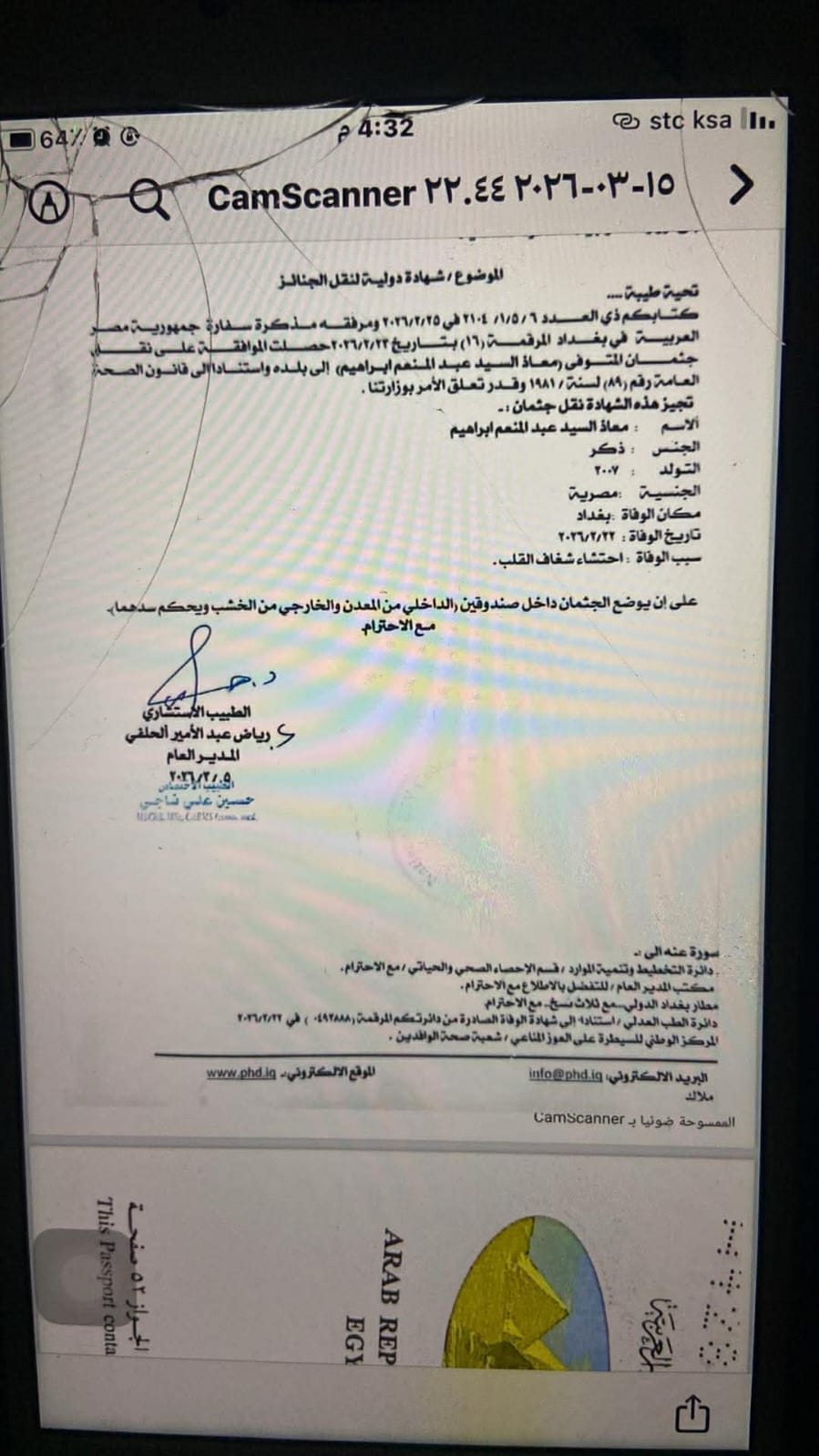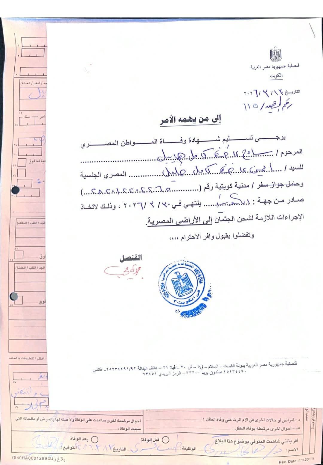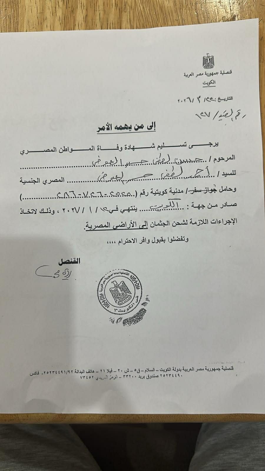 استجابت وزارة الخارجية لنداءات ممثلي المصريين بالخارج، بشأن سرعة نقل جثامين أربعة مصريين توفوا في كلٍّ من الكويت والمملكة العربية السعودية والعراق، وذلك بعد أسابيع من انتظار أسرهم وذويهم، في ظل ظروف إقليمية معقدة تزامنت مع توترات تشهدها المنطقة.