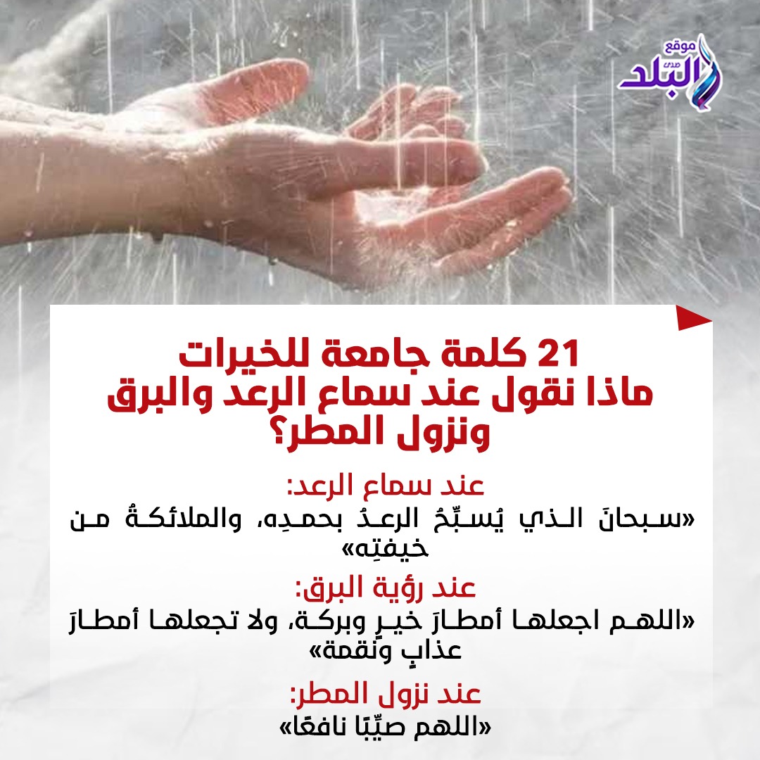 اللهم اجعلها أمطار خير وبركة. اللهم لا تقتلنا بغضبك، ولا تهلكنا بعذابك، وعافنا قبل ذلك، سبحان الذي يسبح الرعد بحمده والملائكة من خيفته.