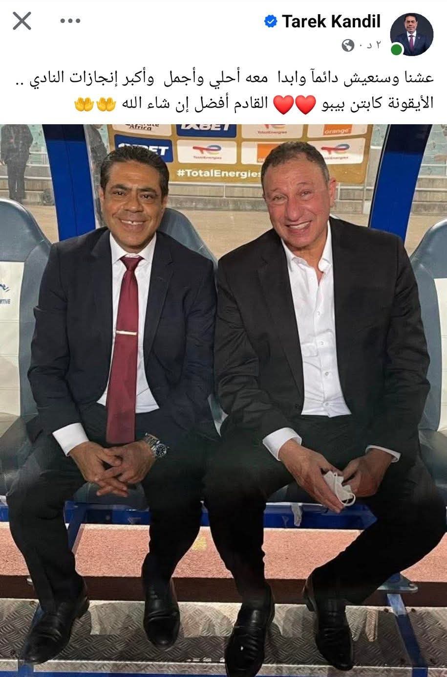 ووجه طارق قنديل رسالة مؤثرة لكاتبن محمود الخطيب كاتبا عبر فيسبوك :عشنا وسنعيش دائما وابدا معه أحلي وأجمل وأكبر إنجازات النادي ... الأيقونة كابتن بيبو القادم أفضل إن شاء الله .