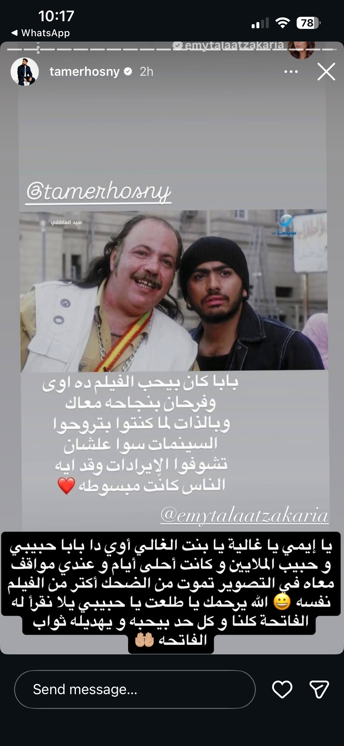 وكتب تامر حسني: “كانت أحلى أيام وعندي مواقف معاه في التصوير تموت من الضحك أكتر من الفيلم نفسه الله يرحمك يا طلعت يا حبيبي يلا نقرأ له الفاتحة كلنا وكل حد بيحبه يهديه ثواب الفاتحة”.