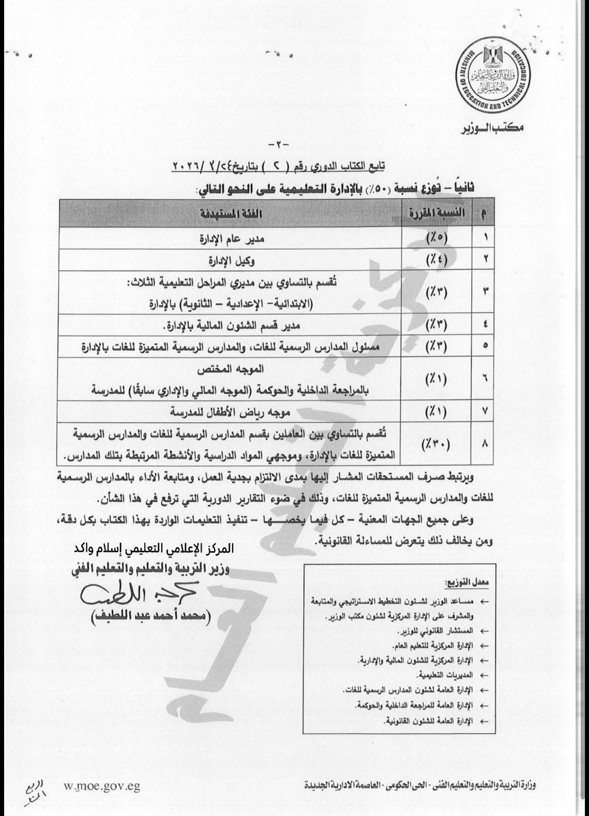 - ٣٪ تقسم بالتساوي بين مديري المراحل التعليمية الثلاث الابتدائية والاعدادية والثانوية بالادارة