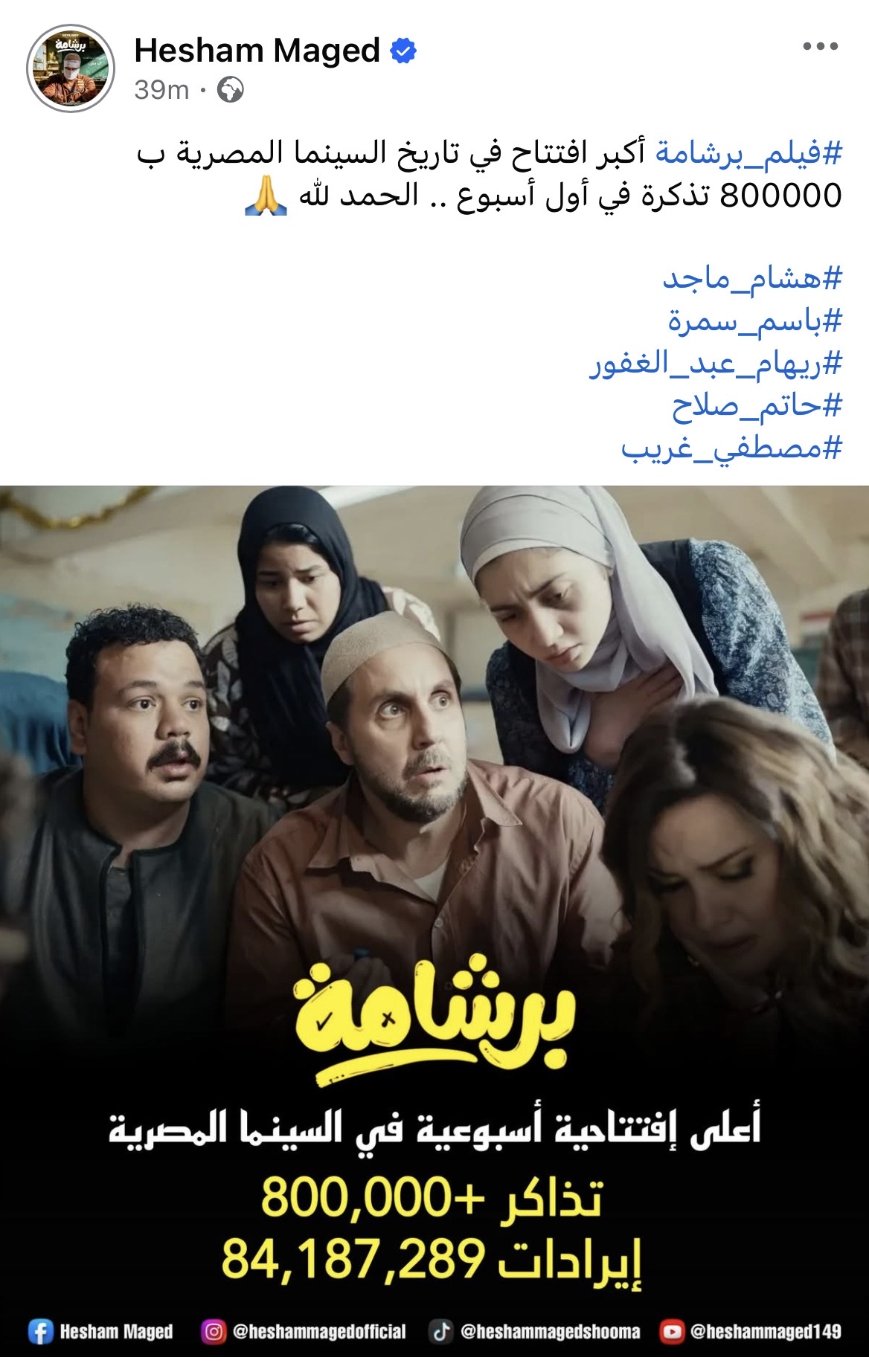 وكتب هشام ماجد عبر “فيسبوك”: “فيلم برشامة أكبر افتتاح في تاريخ السينما المصرية بـ 800000 تذكرة في أول أسبوع.. الحمد لله”.