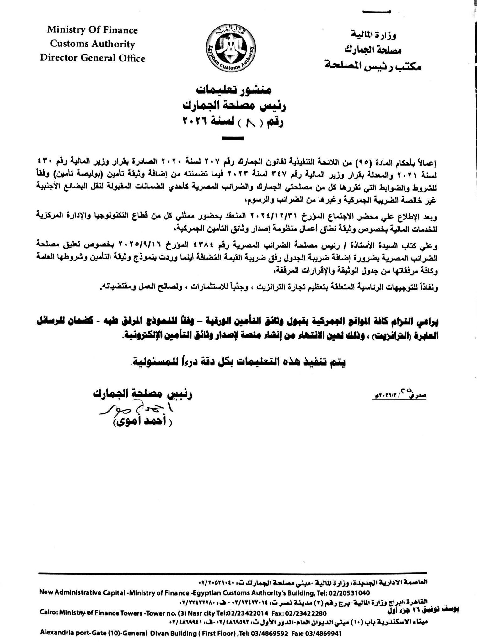 وجه أحمد أموي، رئيس مصلحة الجمارك المصرية؛ كافة الموانئ المصرية بقبول كافة المستندات الورقية بما في ذلك وثائق التأمين التي تقدمها الشركات ومن يمثلهم لعبور رسائل الترانزيت لحين الانتهاء من إنشاء منصة لإصدار وثائق التأمين الإلكترونية.