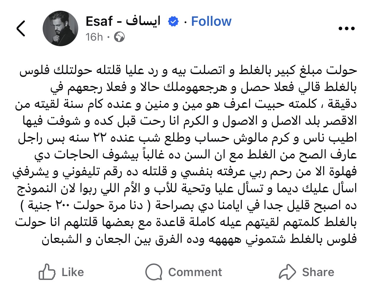 وكتب إيساف: “حولت مبلغ كبير بالغلط و اتصلت بيه و رد عليا قلتله حولتلك فلوس بالغلط قالي فعلا حصل و هرجعهوملك حالا و فعلا رجعهم في دقيقة ، كلمته حبيت اعرف هو مين و منين و عنده كام سنة لقيته من الاقصر بلد الاصل و الاصول و الكرم انا رحت قبل كده و شوفت فيها اطيب ناس و كرم مالوش حساب وطلع شب عنده ٢٢ سنه بس راجل عارف الصح من الغلط مع ان السن ده غالباً بيشوف الحاجات دي فهلوة الا من رحم ربي”.