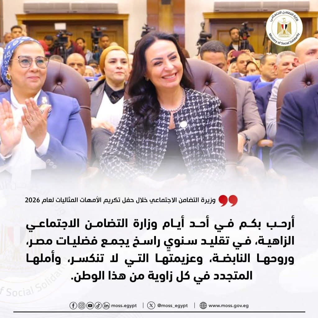 وأعربت وزيرة التضامن الاجتماعي عن ترحيبها بالحضور في أحد أيام وزارة التضامن الاجتماعي الزاهية، في تقليد سنويٍ راسخ يجمع فضليات مصر، وروحها النابضة، وعزيمتها التي لا تنكسر، وأملها المتجدد في كل زاوية من هذا الوطن.