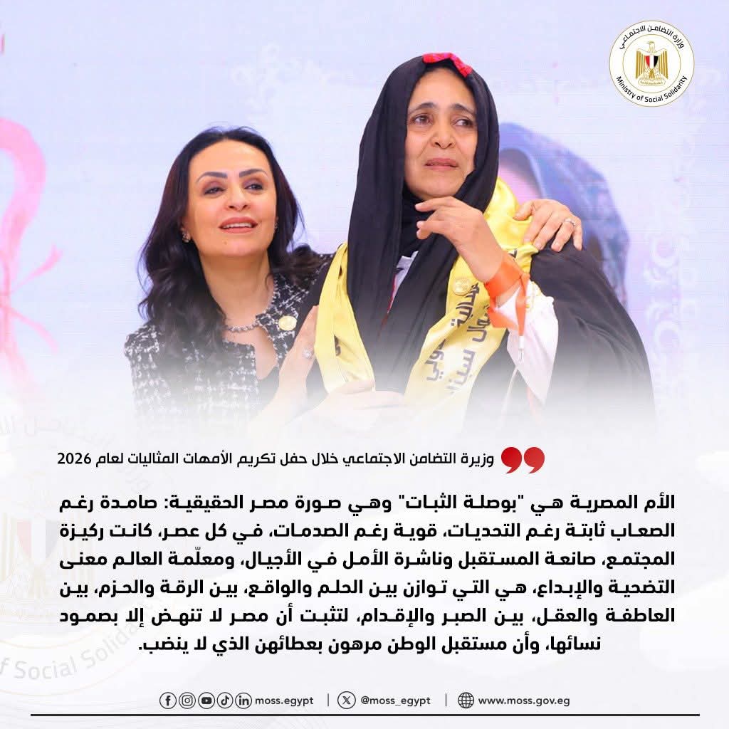 وسلمت وزيرة التضامن الاجتماعي ورئيسة المجلس القومي للمرأة الأمهات المثاليات لعام 2026 شهادات التكريم تقديراً لمجهودهن ورحلة العطاء الملهمة الخاصة بكل أم.