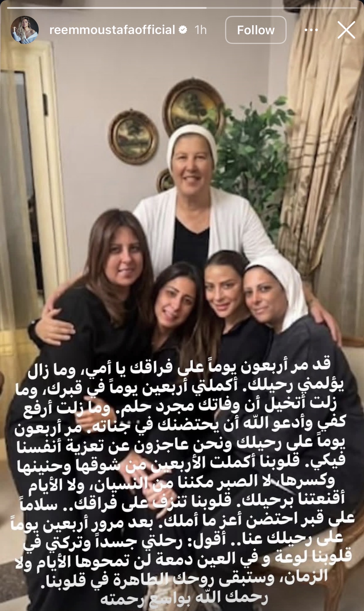 وفي رسالتها، قالت ريم: “قد مر أربعون يومًا على فراقك يا أمي، وما زال رحيلك يؤلمني، وما زلت أتصور أن وفاتك مجرد حلم، وأرفع كفي إلى الله أن يحتضنك في جناته”. وأضافت: “مرت أربعون يومًا ونحن عاجزون عن التكيف مع غيابك، قلوبنا لا تزال تنزف شوقًا وحنينًا، ولن تمحو دموعنا مرور الأيام”.