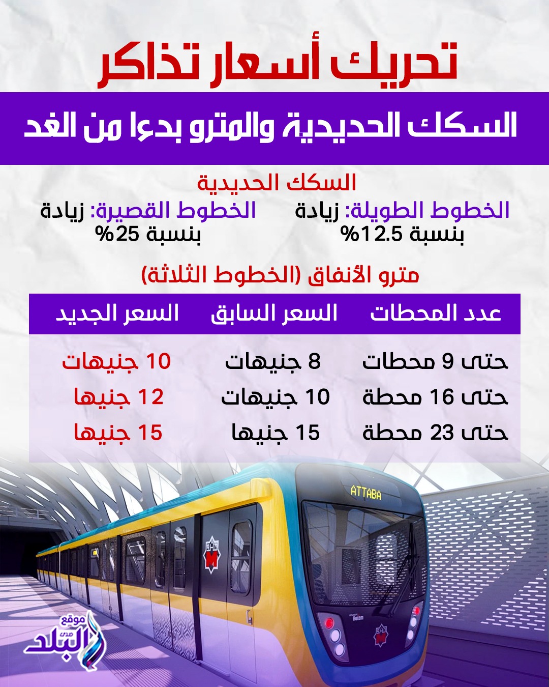 أصدرت وزارة النقل بياناً إعلامياً اليوم أشارت فيه إلى أنه في إطار نهج الوزارة باطلاع الرأي العام على كافة الحقائق المتعلقة بالخدمات التي تقدمها الوزارة وهيئاتها وشركاتها التابعة لجمهور المواطنين فقد تقرر بدءاً من صباح يوم الجمعة الموافق 27 مارس 2026 تحريك اسعار تذاكر قطارات السكك الحديدية وأسعار تذاكر بعض الشرائح الخاصة بركوب مترو الأنفاق وثبات بعضها كالتالي :