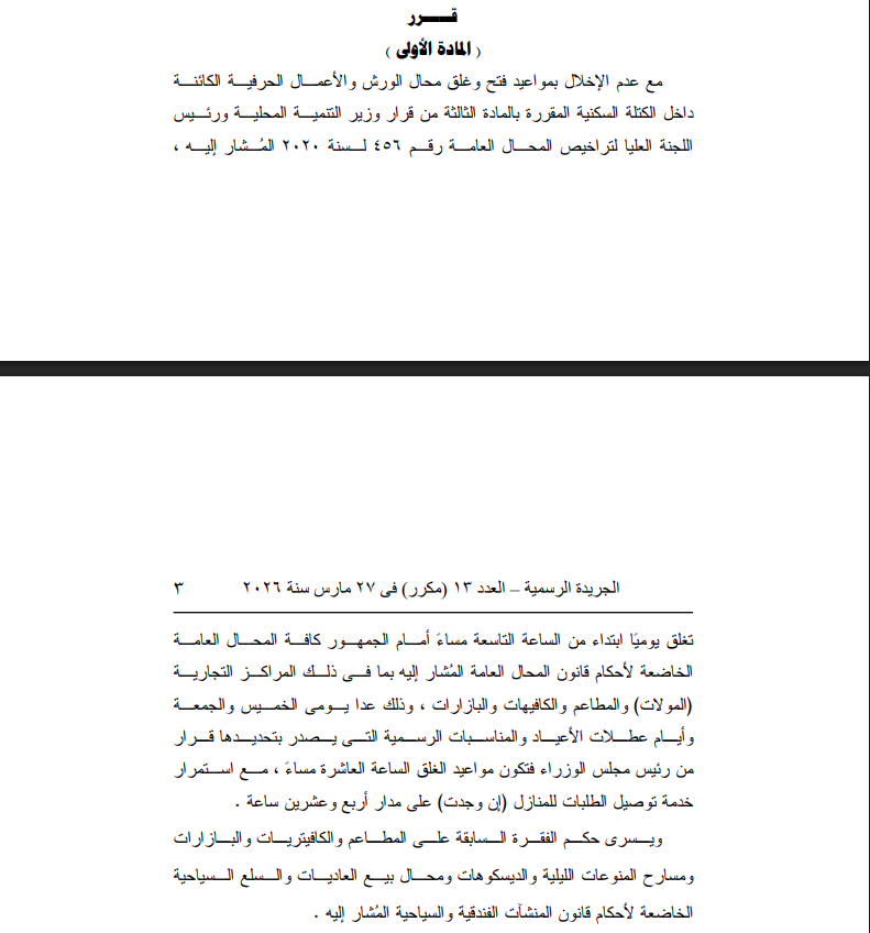 ونص القرار في مادته الأولى على أنه "مع عدم الإخلال بمواعيد فتح وغلق محال الورش والأعمال الحرفية الكائنة داخل الكتلة السكنية، المقررة بالمادة الثالثة من قرار وزير التنمية المحلية ورئيس اللجنة العليا لتراخيص المحال العامة رقم 456 لسنة 2020 (بشأن مواعيد فتح وغلق المحال العامة)، تُغلق يوميا ابتداء من الساعة التاسعة مساءً أمام الجمهور كافة المحال العامة (الخاضعة لأحكام قانون المحال العامة الصادر بالقانون رقم 154 لسنة 2019)، بما في ذلك المراكز التجارية (المولات)، والمطاعم، والكافيهات، والبازارات، وذلك عدا يومي الخميس والجمعة وأيام عطلات الأعياد، والمناسبات الرسمية التي يصدر بتحديدها قرار من رئيس مجلس الوزراء فتكون مواعيد الغلق العاشرة مساءً، مع استمرار خدمة توصيل الطلبات للمنازل (إن وجدت) على مدار أربع وعشرين ساعة.