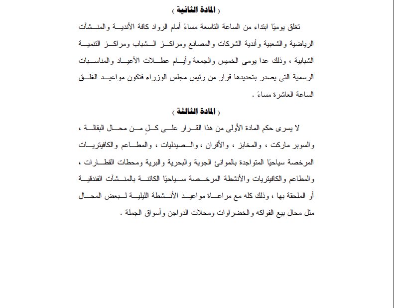 ونصت المادة الثالثة من القرار على أنه لا يسري حكم المادة الأولى من هذا القرار على كلٍ من محال البقالة، والسوبر ماركت، والمخابز، والأفران، والصيدليات، والمطاعم والكافيتريات المرخصة سياحيا المتواجدة بالموانئ الجوية والبحرية والبرية، ومحطات القطارات، والمطاعم والكافيتريات والأنشطة المرخصة سياحيا الكائنة بالمنشآت الفندقية أو الملحقة بها، وذلك كله مع مراعاة مواعيد الأنشطة الليلية لبعض المحال مثل محال بيع الفواكه والخضراوات ومحلات الدواجن وأسواق الجملة.