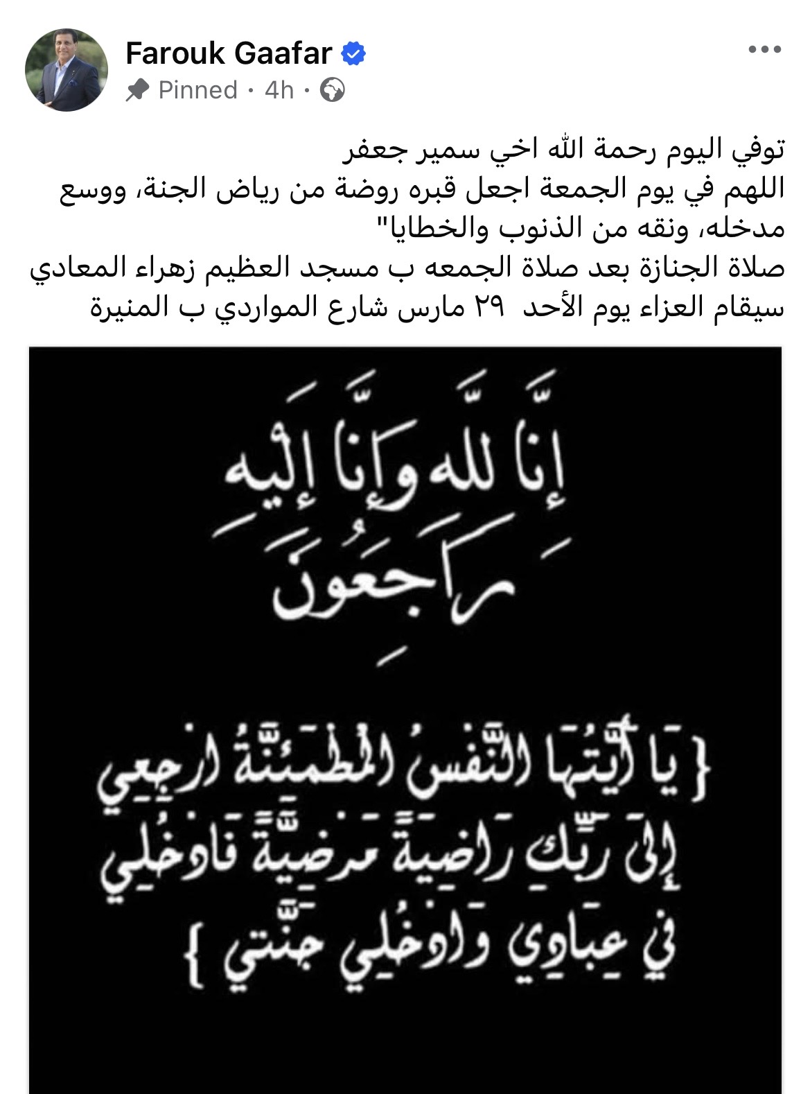 وكشف فاروق جعفر عبر حسابه على فيسبوك، بأنه من المقرر عزاء شقيقه الراحل مساء يوم الأحد المقبل بمنطقة المنيرة بالقاهرة.