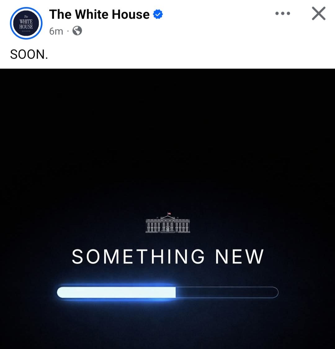 وكتب البيت الأبيض في منشوره كلمة واحدة "قريبا" تعليقا على صورة مكتوب عليها "something new" دون توضيح أي تفاصيل أخرى حول الأمر المقصود من هذا المنشور الغامض.