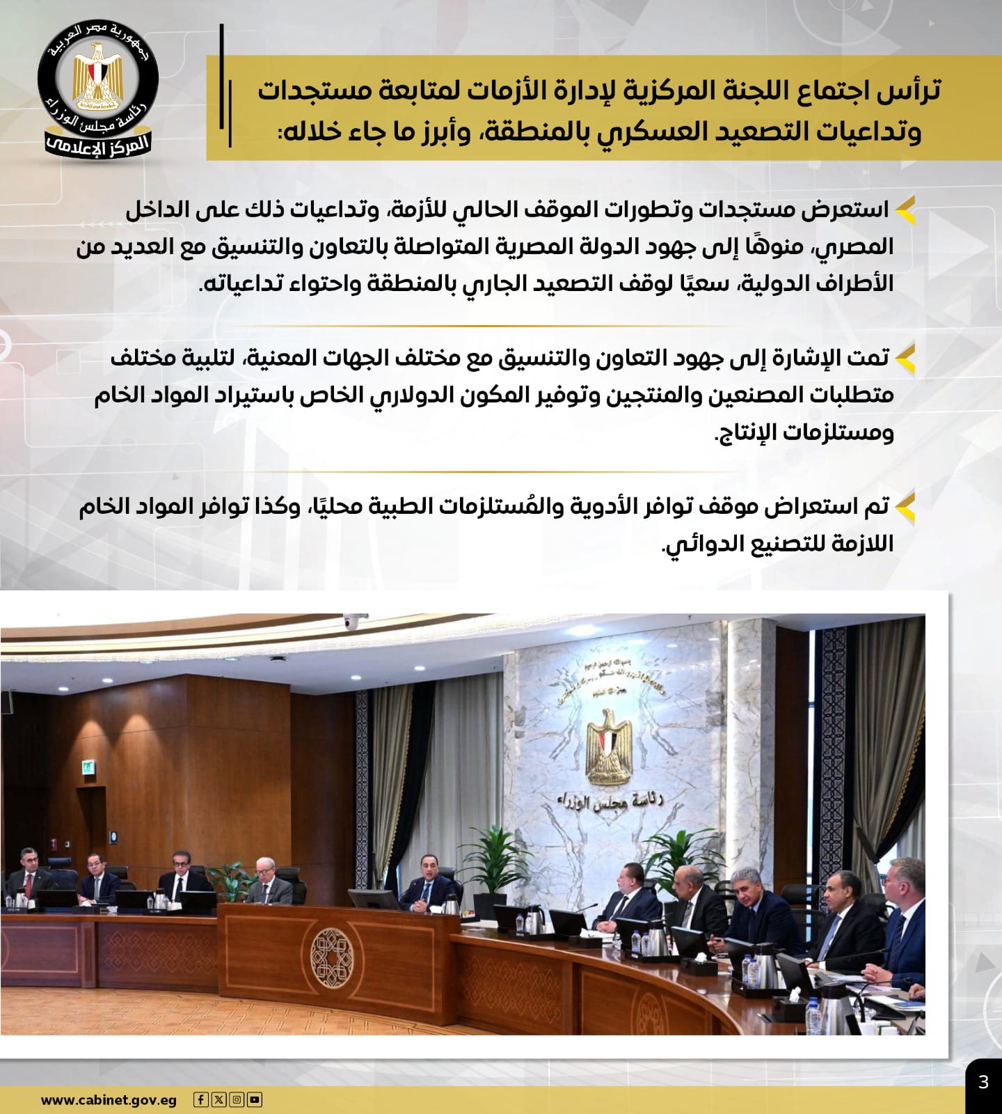 وشملت الأنشطة، ترؤس سيادته اجتماع اللجنة المركزية لإدارة الأزمات، لمتابعة مستجدات وتداعيات التصعيد العسكري بالمنطقة، والذي استعرض خلاله مستجدات وتطورات الموقف الحالي للأزمة، وتداعيات ذلك على الداخل المصري، منوهًا إلى جهود الدولة المصرية المتواصلة بالتعاون والتنسيق مع العديد من الأطراف الدولية، سعيًا لوقف التصعيد الجاري بالمنطقة واحتواء تداعياته.