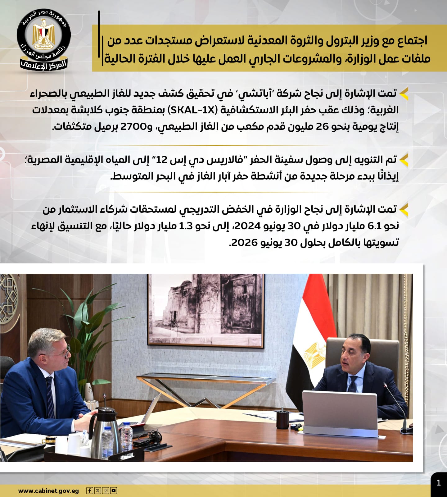 وتضمنت الأنشطة، اجتماع رئيس الوزراء مع وزير البترول والثروة المعدنية، لاستعراض مستجدات عدد من ملفات عمل الوزارة، والمشروعات الجاري العمل عليها خلال الفترة الحالية، حيث تمت الإشارة إلى نجاح شركة "أباتشي" في تحقيق كشف جديد للغاز الطبيعي بالصحراء الغربية؛ وذلك عقب حفر البئر الاستكشافية (SKAL-1X) بمنطقة جنوب كلابشة بمعدلات إنتاج يومية بنحو 26 مليون قدم مكعب من الغاز الطبيعي، و2700 برميل متكثفات، كما تم التنويه إلى وصول سفينة الحفر "فالاريس دي إس 12" إلى المياه الإقليمية المصرية؛ إيذانًا ببدء مرحلة جديدة من أنشطة حفر آبار الغاز في البحر المتوسط.