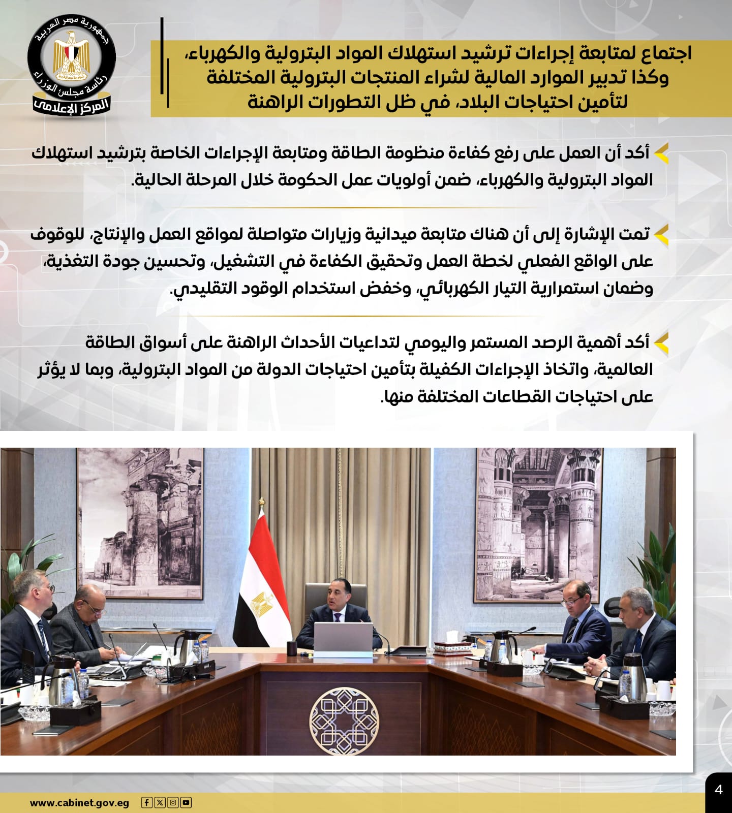 وعقد رئيس الوزراء اجتماعًا لمتابعة إجراءات ترشيد استهلاك المواد البترولية والكهرباء، وكذا تدبير الموارد المالية لشراء المنتجات البترولية المختلفة لتأمين احتياجات البلاد، في ظل التطورات الراهنة، مؤكدًا أن العمل على رفع كفاءة منظومة الطاقة ومتابعة الإجراءات الخاصة بترشيد استهلاك المواد البترولية والكهرباء، ضمن أولويات عمل الحكومة خلال المرحلة الحالية.