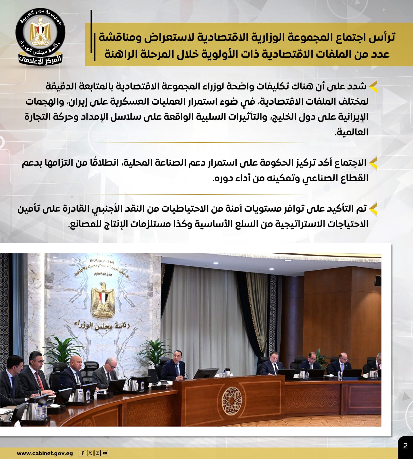 كما ترأس اجتماع المجموعة الوزارية الاقتصادية لاستعراض ومناقشة عدد من الملفات الاقتصادية ذات الأولوية خلال المرحلة الراهنة، وشدد على أن هناك تكليفات واضحة لوزراء المجموعة الاقتصادية بالمتابعة الدقيقة لمختلف الملفات الاقتصادية، في ضوء استمرار العمليات العسكرية على إيران، والهجمات الإيرانية على دول الخليج، والتأثيرات السلبية الواقعة على سلاسل الإمداد وحركة التجارة العالمية.