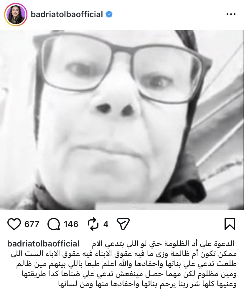 ونشرت بدرية طلبة صورة السيدة عبر حسابها الشخصي على موقع تبادل الصور والفيديوهات إنستجرام وعلقت:"الدعوة على قدّ المظلومة، حتى لو اللي بتدعي الأم، ممكن تكون أم ظالمة، وزي ما فيه عقوق الأبناء فيه عقوق الآباء. الست اللي طلعت تدعي على بناتها وأحفادها، والله أعلم طبعًا باللي بينهم مين ظالم ومين مظلوم، لكن مهما حصل مينفعش تدعي على ضناها كده .. طريقتها وعنيها كلها شر، ربنا يرحم بناتها وأحفادها منها ومن لسانها".