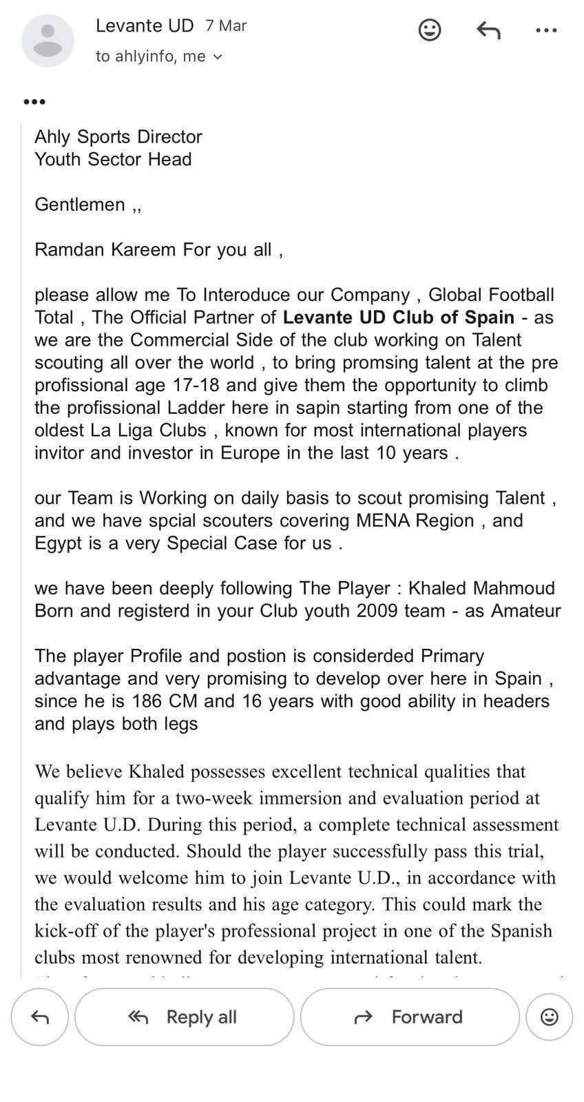 توجّه نادي ليفانتي الإسباني بخطاب رسمي إلى إدارة النادي الأهلي، ممثلة في المدير الرياضي ورئيس قطاع الناشئين، وذلك في إطار تعزيز التعاون الكروي واكتشاف المواهب الشابة الواعدة.