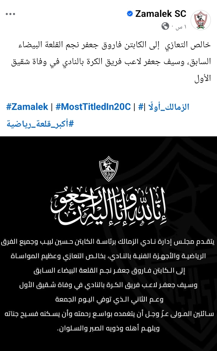 وكتب الزمالك عبر حسابه الرسمي علي فيسبوك: "يتقدم مجلس إدارة نادي الزمالك برئاسة حسين لبيب وجميع الفرق الرياضية والأجهزة الفنية بالنادي، بخالص التعازي وعظيم المواساة إلى الكابتن فاروق جعفر نجم القلعة البيضاء السابق، وسيف جعفر لاعب فريق الكرة بالنادي في وفاق شقيق الأول، وعم الثاني، الذي توفي اليوم الجمعة، سائلين المولى عز وجل أن يتغمدة بواسع رحمته وأن يسكنه فسيح جناته ويلهم أهله وذويه الصبر والسلوان".