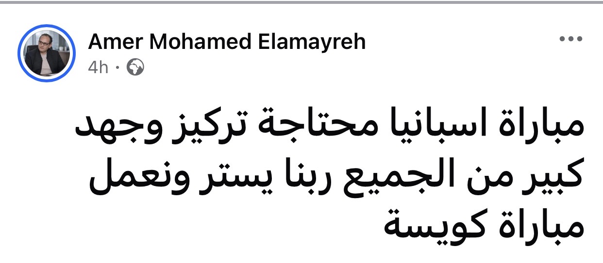 وجه الناقد الرياضي عامر العمايرة رسالة للاعبي منتخب مصر قبل مواجهة إسبانيا عبر حسابه الشخصي بموقع فيسبوك قائلًا: “مباراة إسبانيا محتاجة تركيز وجهد كبير من الجميع ربنا يستر ونعمل مباراة كويسة”.