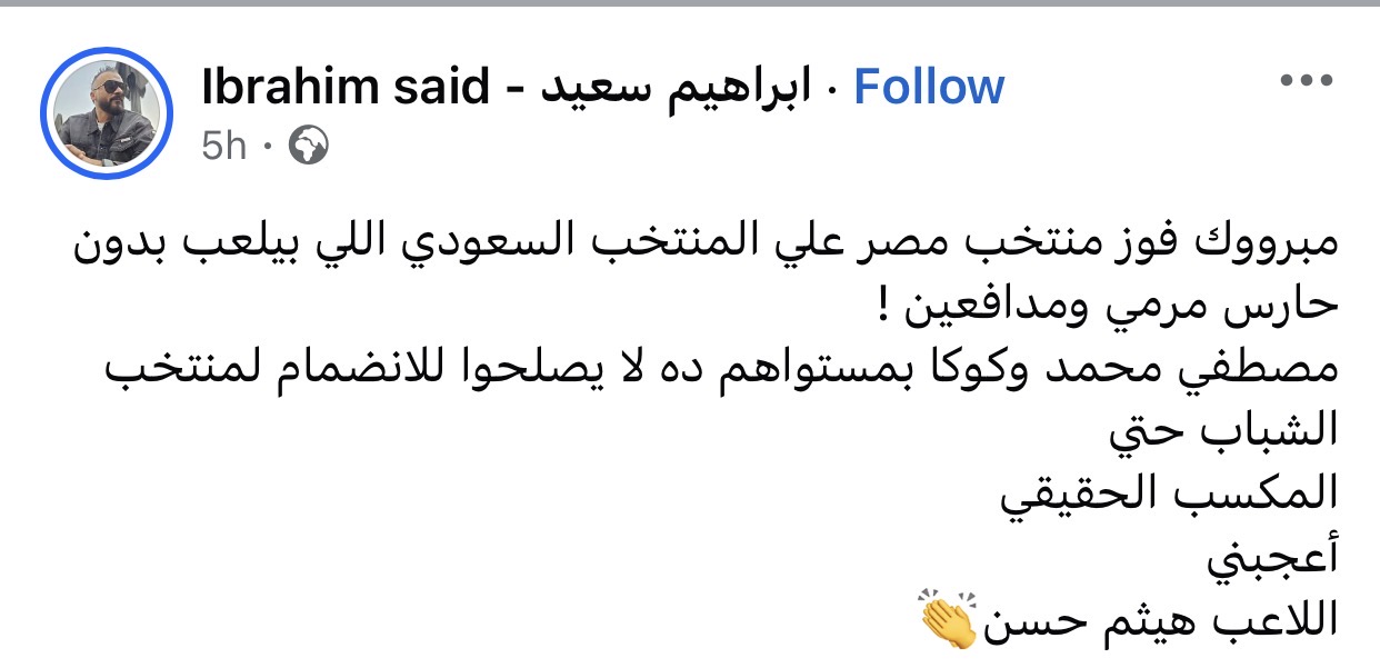 وكتب إبراهيم سعيد عبر حسابه الشخصي بموقع فيسبوك: “مبرووك فوز منتخب مصر علي المنتخب السعودي اللي بيلعب بدون حارس مرمي ومدافعين”.