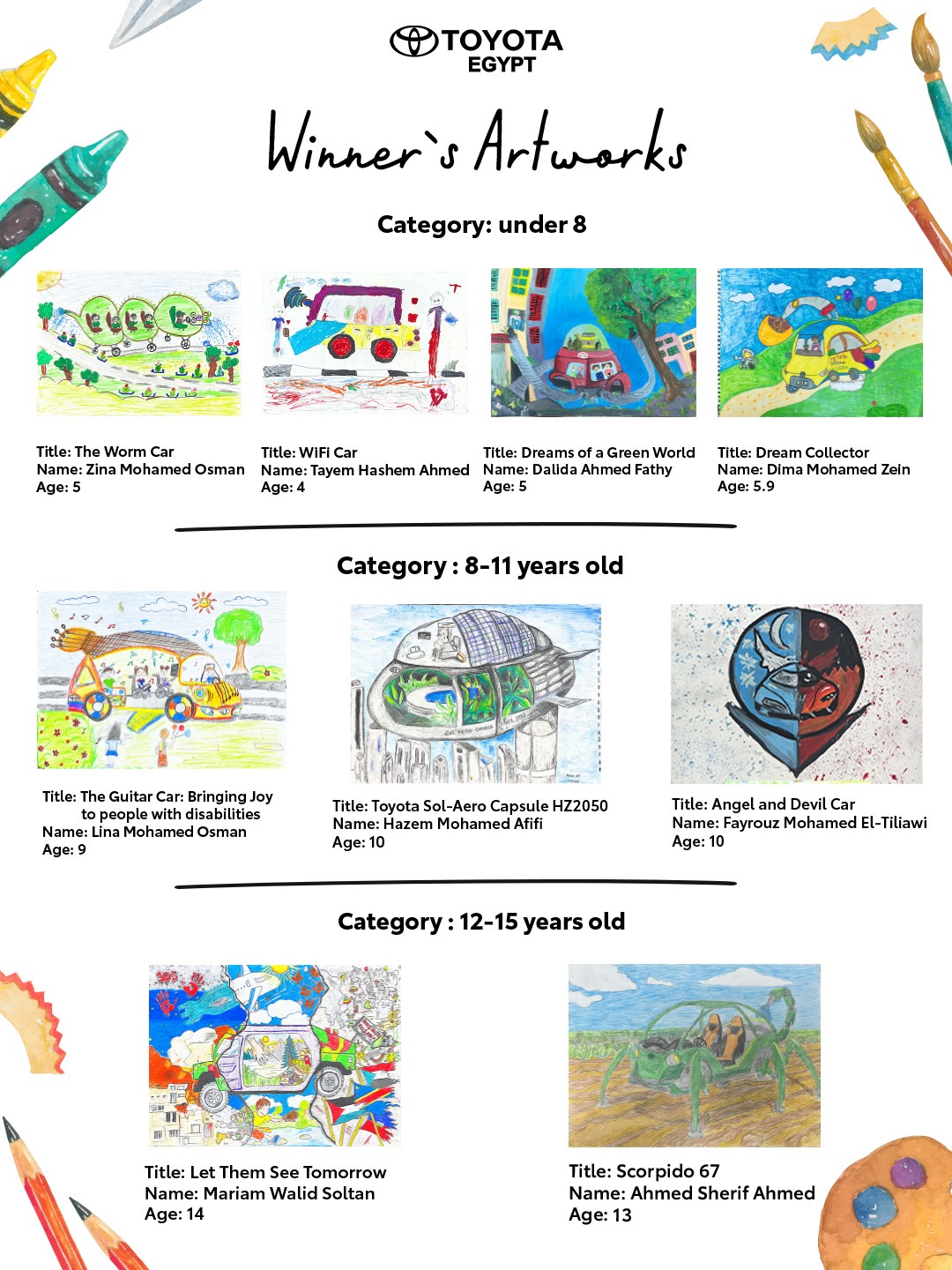 وشهدت مسابقة تويوتا هذا العام مشاركة واسعة لأكثر من 200 طفل بدعم من شركاء استراتيجيين منهم مكتبات مختلفة بالإضافة إلى العديد من المدارس المشاركة، ما أسهم في إتاحة الفرصة لعدد كبير من المواهب الشابة للتعبير عن أفكارهم الفنية.
